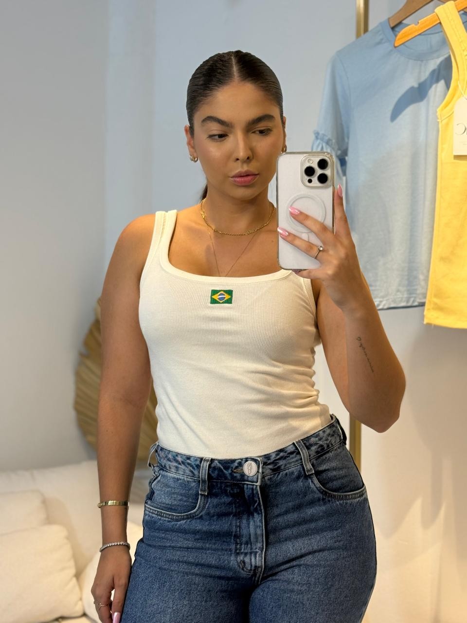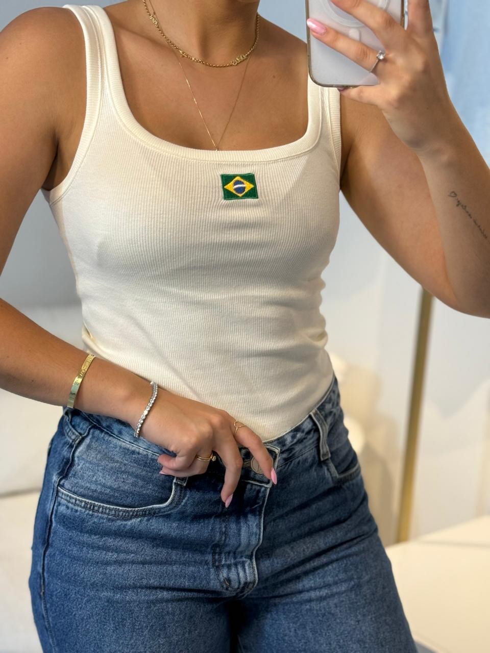 AdicionarRegata amarela manteiga, elegante e bordada a linha com a bandeira do Brasil