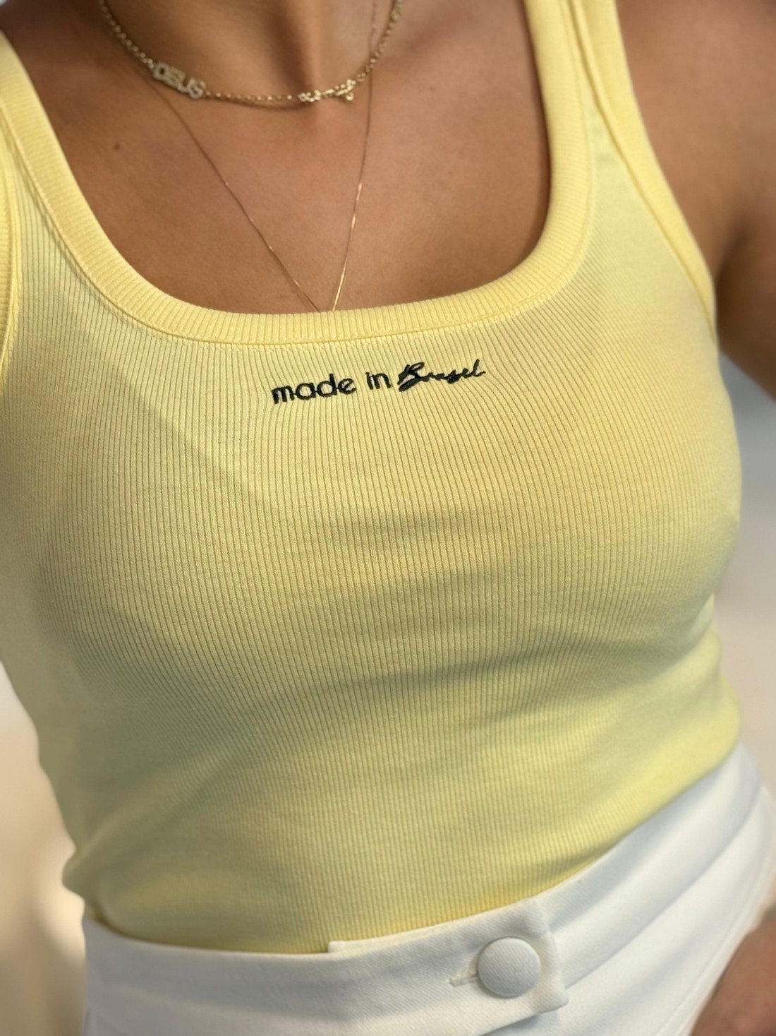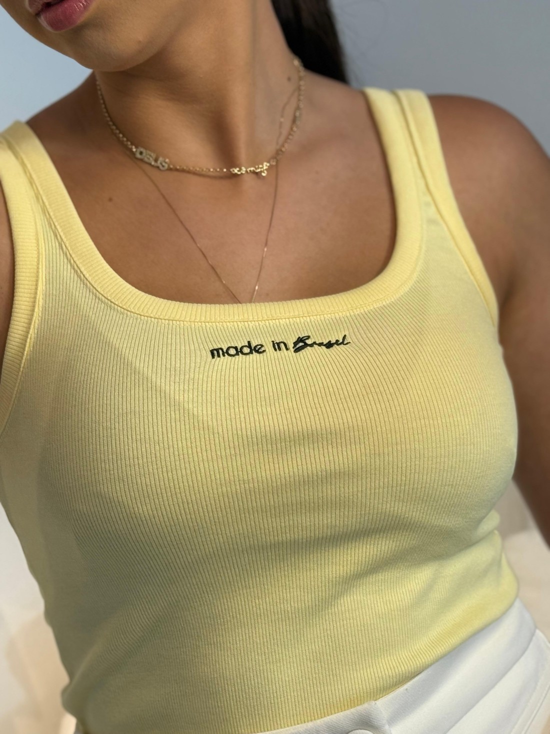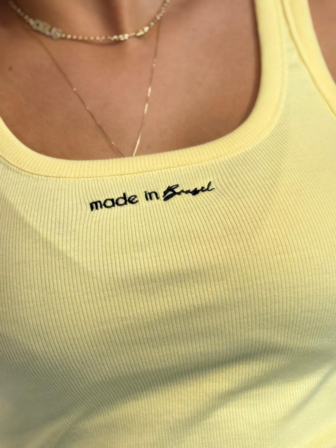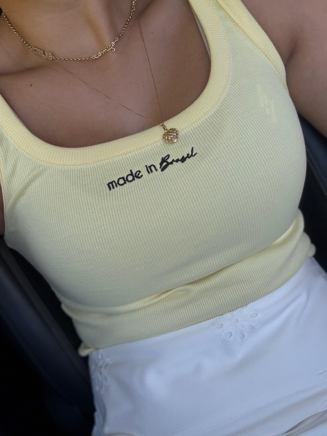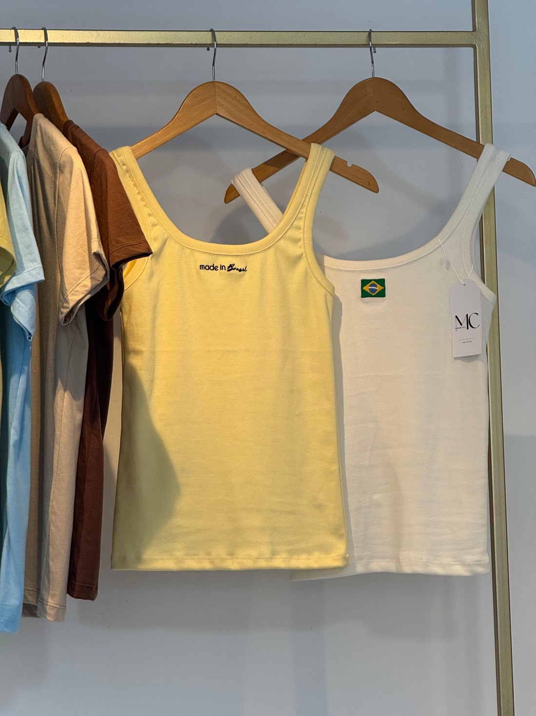 T-shirt Feminina Regata off white, elegante e bordada a linha com a bandeira do Brasil