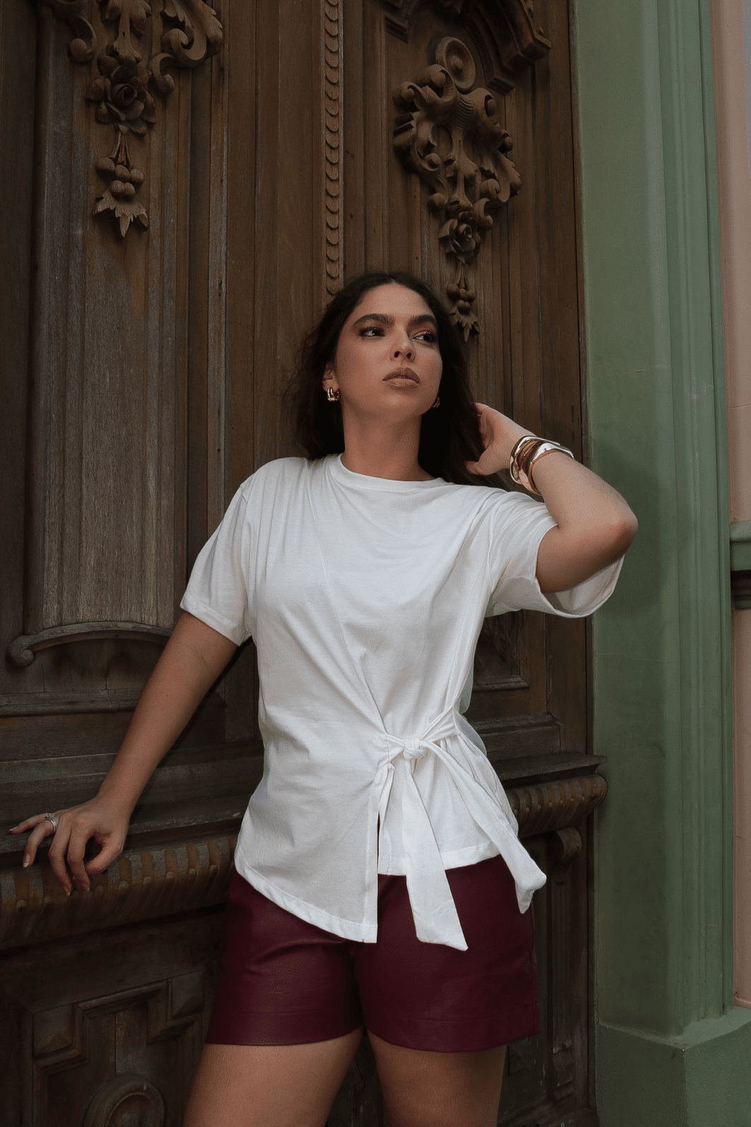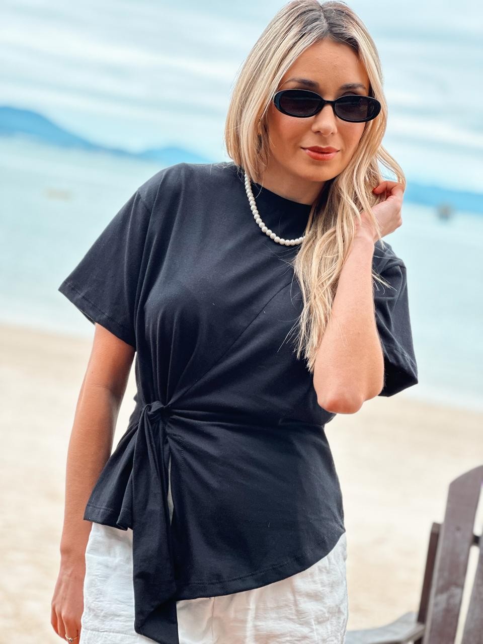 Detalhe transpassado que valoriza a cintura e traz assimetria moderna