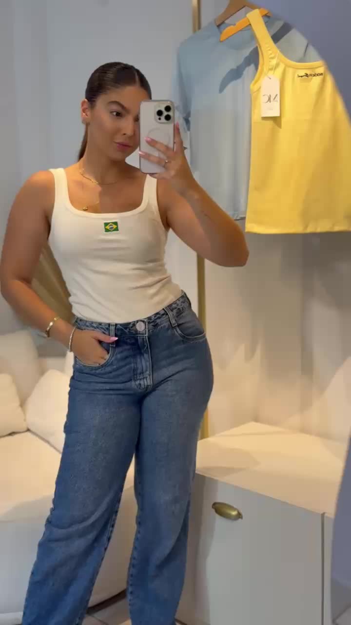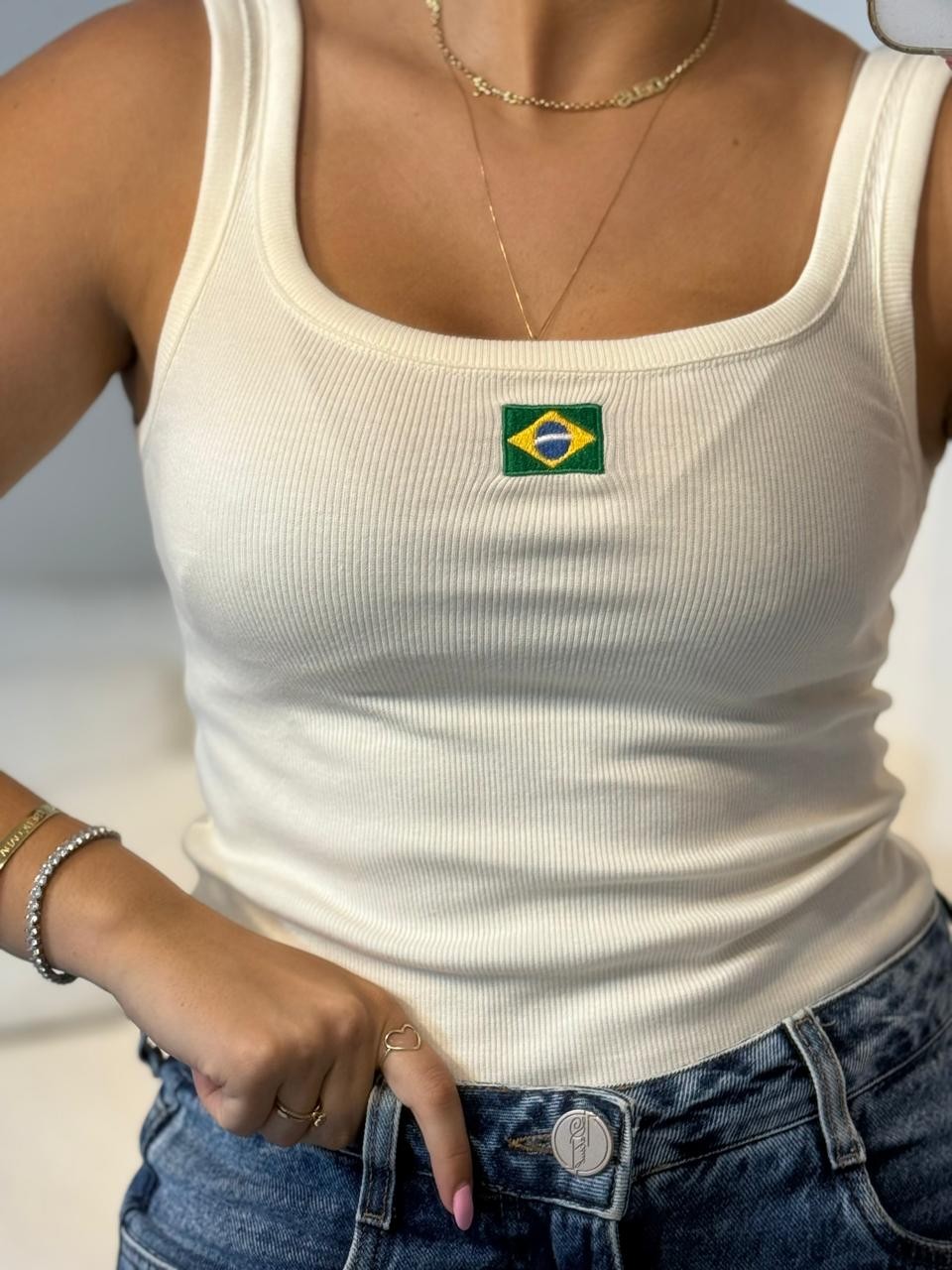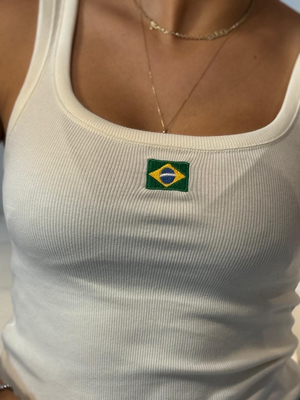 AdicionarRegata amarela manteiga, elegante e bordada a linha com a bandeira do Brasil